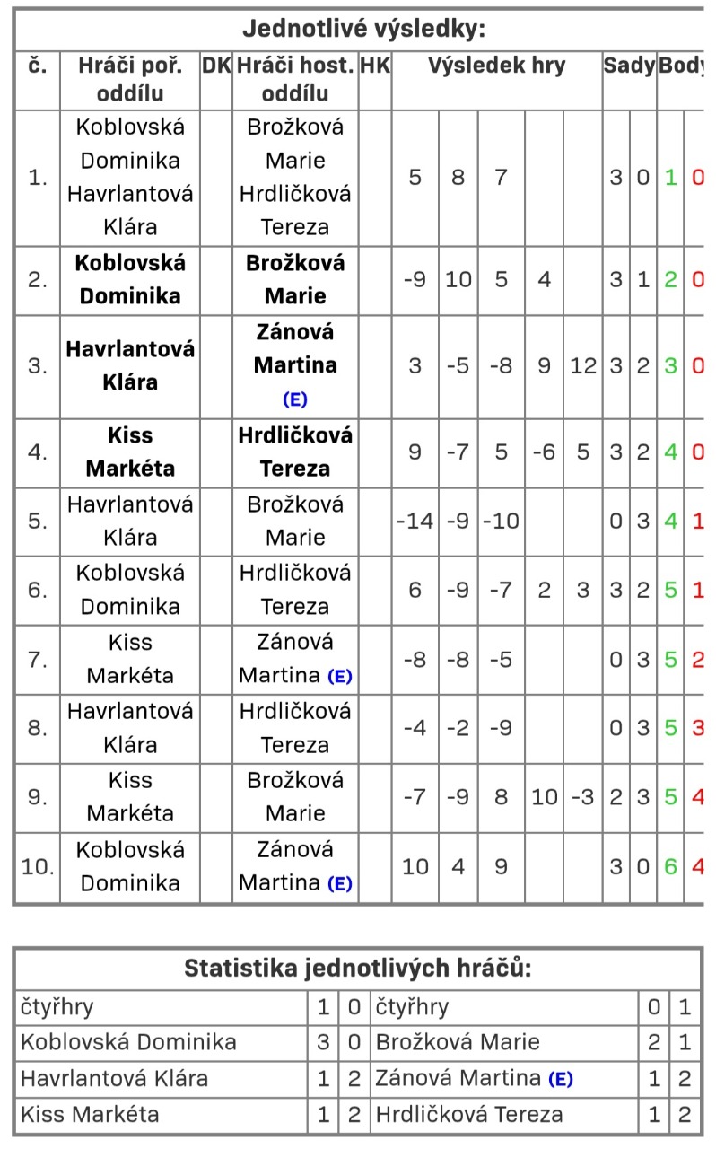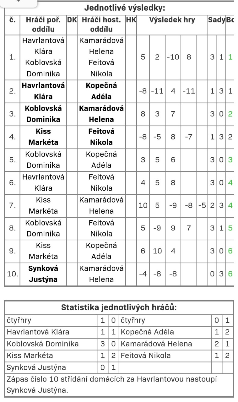 Dnes se hrály zápasy druhé ligy žen a to první v roce 2026. Naše hráčky se utkaly od 9:30 s TTC MS Brno B a po bitvě vyhrály 6:4. Druhý zápas od 14:30 proti HB Ostrov C skončil stejným výsledkem 6:4 pro nás. Děvčatům blahopřejeme a těšíme se na další zápasy.